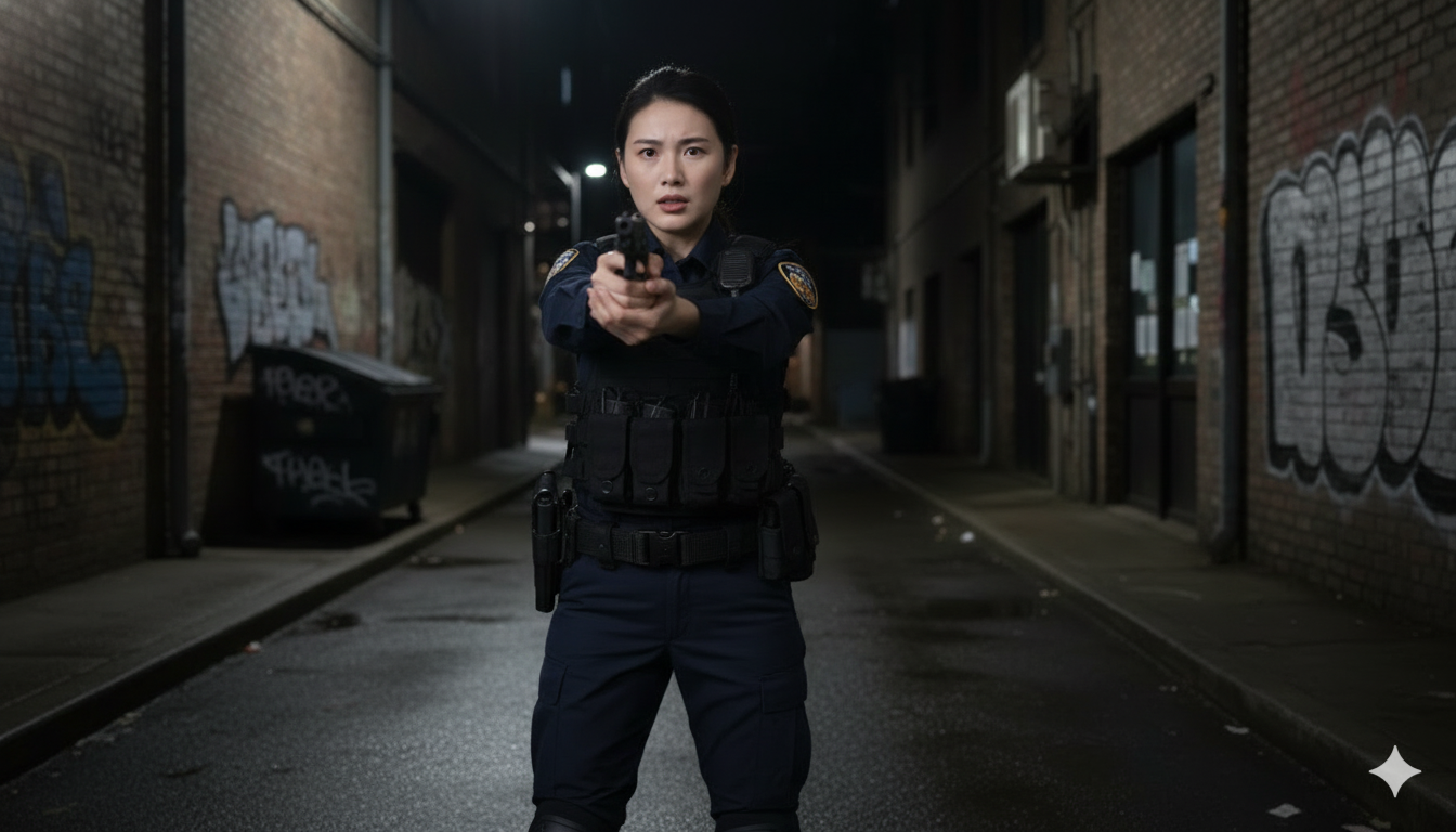 Give me JSON prompt for: the woman wearing a police tactical uniform, standing in a dark