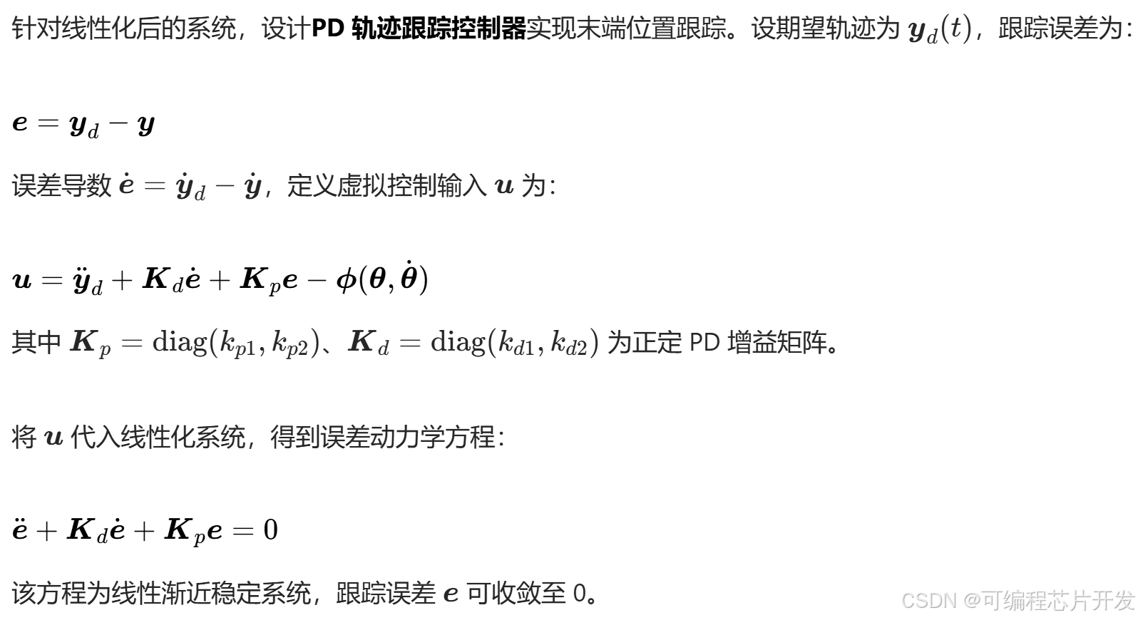 高精度跟踪:PD控制器可保证轨迹跟踪误差渐近收敛,适用于高精度运动控制场景。