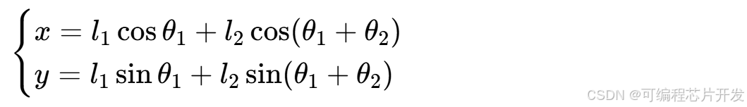 设双连杆机器人为旋转关节型,连杆1长度l1、质量m1,连杆2长度l2、质量m2;关节角分别为θ1,θ2,关节角速度θ˙1, θ˙2,关节角加速度θ¨1, θ¨2;关节输入力矩为τ1,τ2。末端执行器的平面坐标(x,y)与关节角的正运动学关系为: