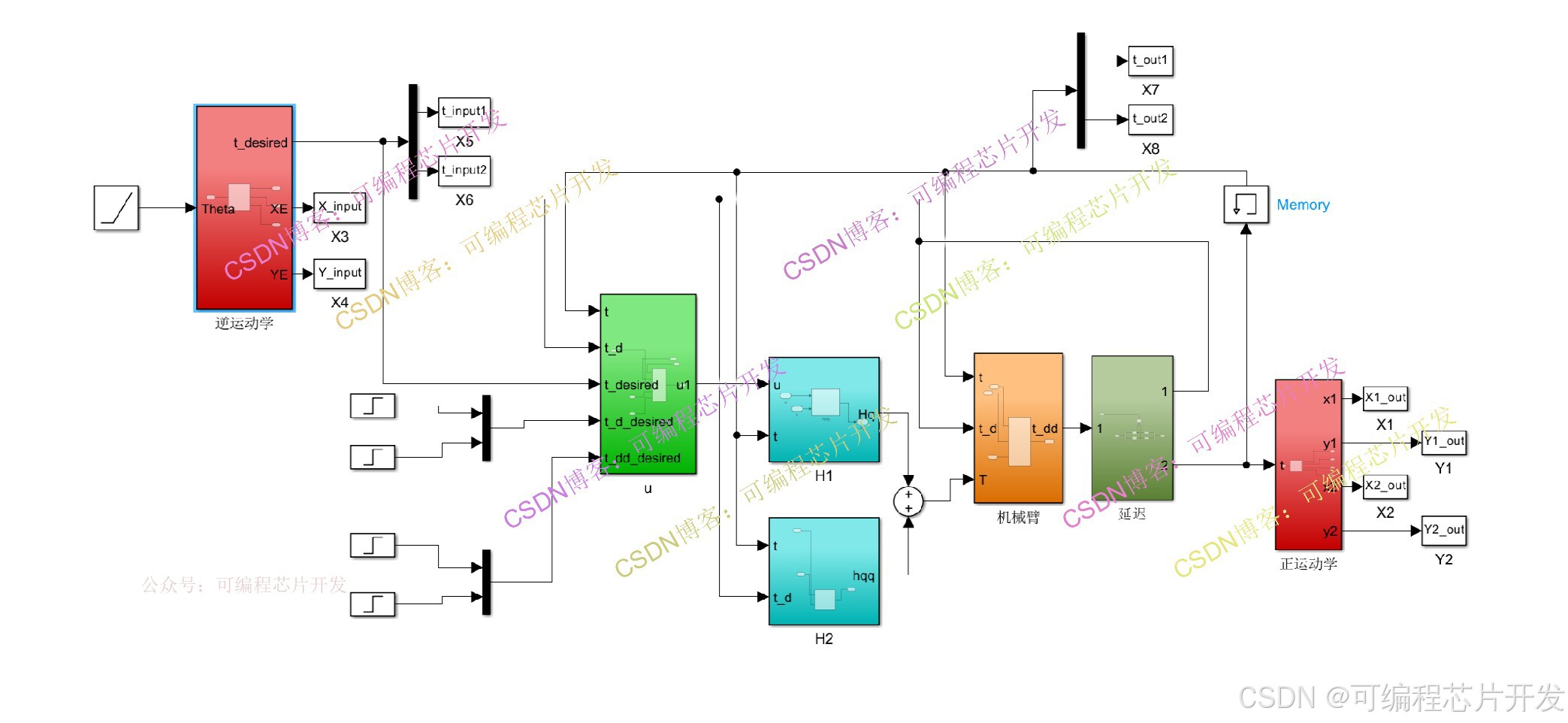 反馈线性化是一种非线性控制方法,核心思想是通过状态反馈和坐标变换,将非线性系统的动力学模型转化为完全可控的线性系统,再设计线性控制器实现高精度轨迹跟踪。本文研究了双连杆机器人基于反馈线性化的轨迹跟踪控制方法。通过非线性状态反馈和坐标变换,将系统动力学转化为完全可控的线性系统,并设计PD控制器实现高精度跟踪。该方法消除了惯性耦合、科氏力和重力影响,但控制效果依赖模型参数精度。研究包含动力学原理分析、控制算法设计及simulink仿真验证。