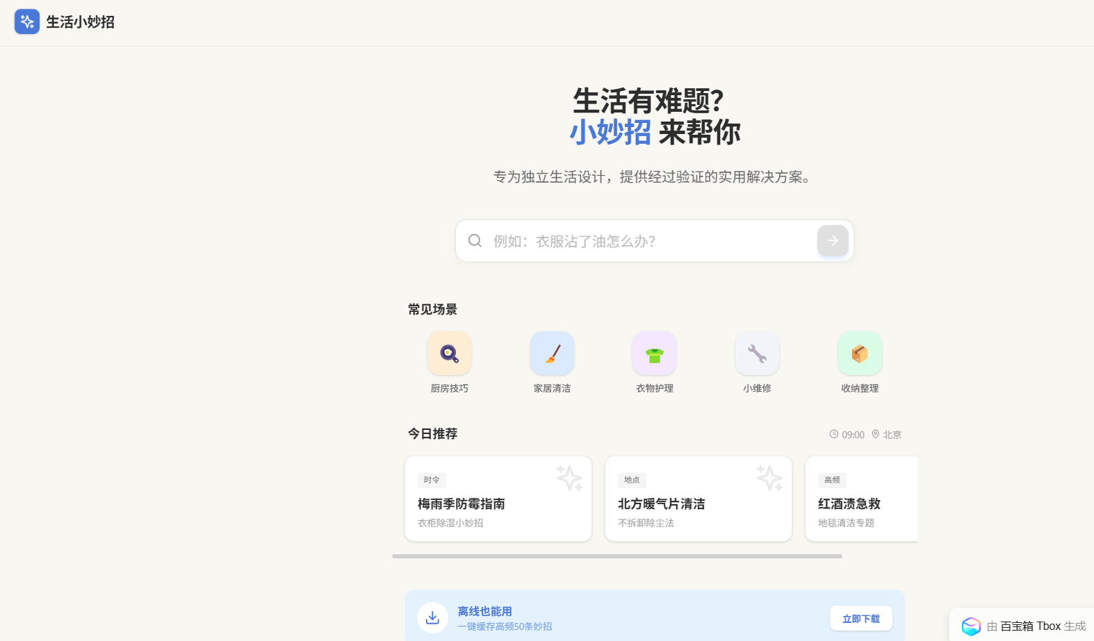 使用 Tbox 开发这个生活小妙招应用的过程,让我体验到了 AI 时代产品开发的全新模式。这不仅仅是工具的升级,更是思维方式的转变------从"我能做什么"到"用户需要什么",从"功能堆砌"到"体验优化"。