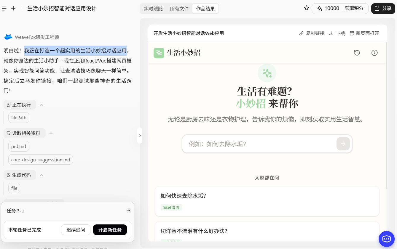 我输入的是:帮我生成一个"生活小妙招"智能对话式应用。