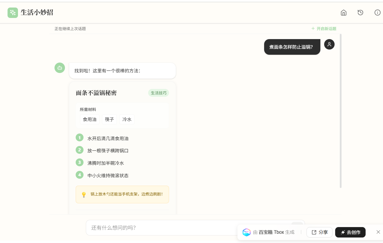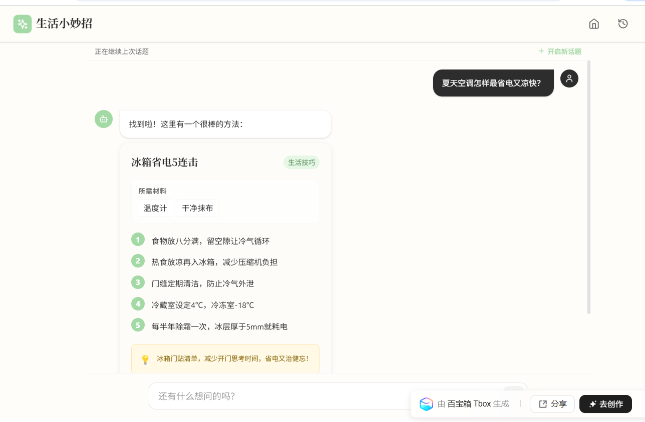 最近我使用 Tbox 完成了一个"生活小妙招"智能对话式应用的开发,发现真是太赞了!