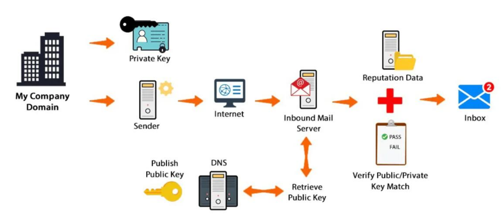 - 发件方域名所有者生成公私钥对,私钥用于对邮件内容签名,公钥发布在发送域的DNS TXT记录中