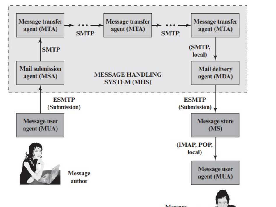 发件人MUA -ESTMP-> 发件服务器MSA -DNS,SMTP-> 中转站MTA -SMTP-...-SMTP-> 中转站MTA -SMTP-> 邮件投递代理MDA -ESTMP-> 收件服务器 -POP/IMAP->收件人MUA