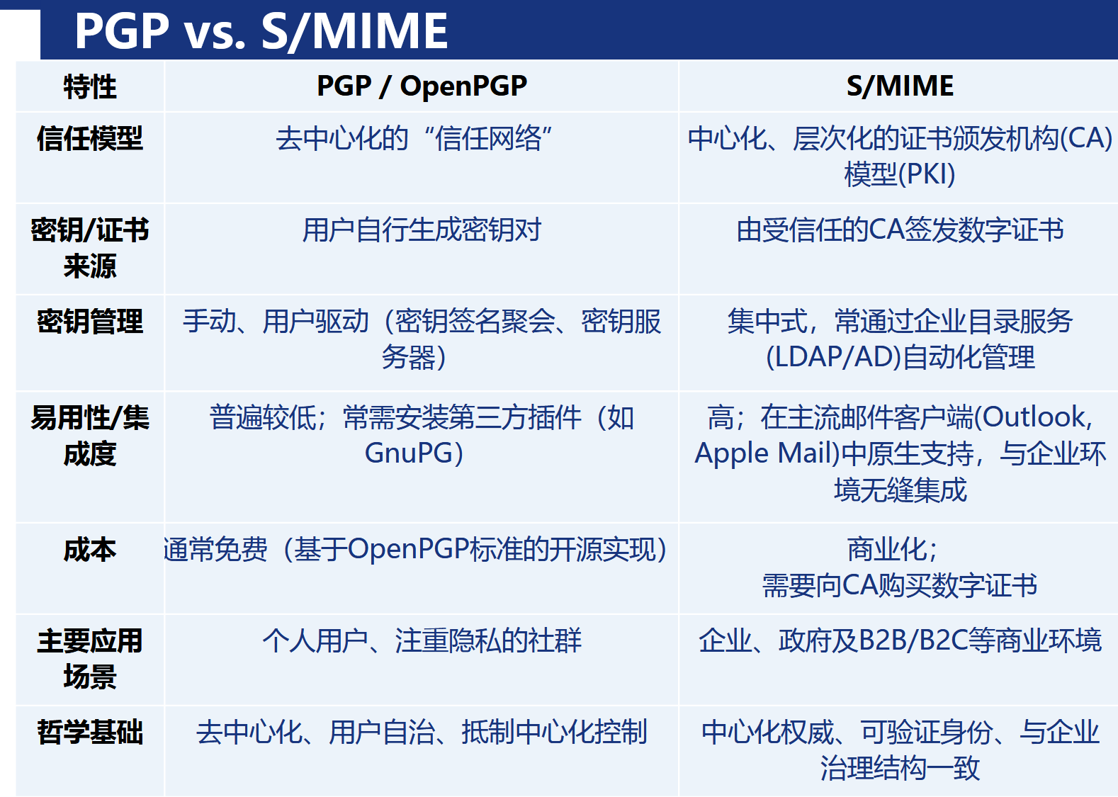 - 电子邮件会在经过的每一个MTA中停留,存储,排队,在这个过程中,邮件是以明文形式存储在服务器硬盘上的
