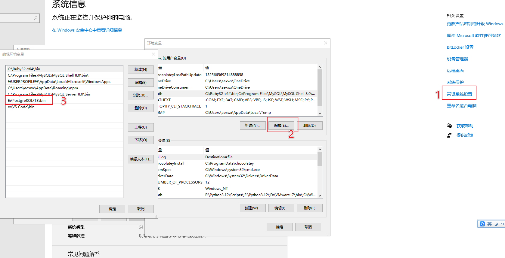 例如把E:\PostgreSQL\18\bin加入到Path的系统变量