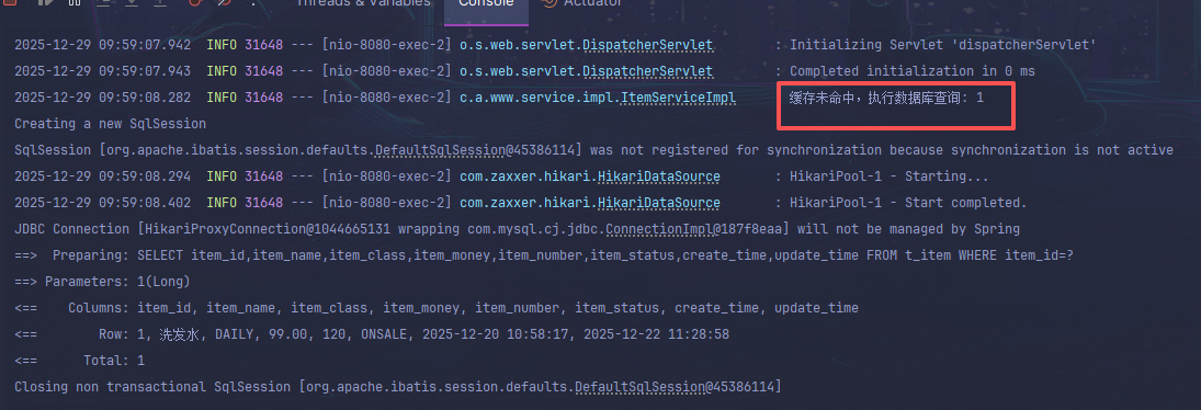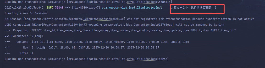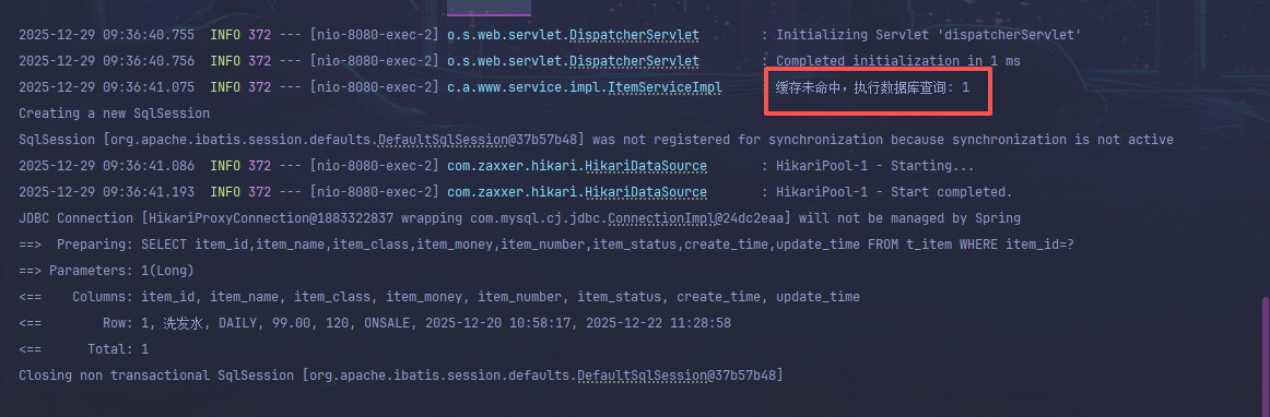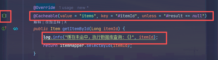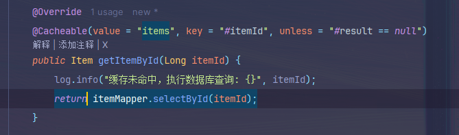 @Override @Cacheable(value = "items", key = "#itemId", unless = "#result == null") public Item getItemById(Long itemId) { log.info("缓存未命中,执行数据库查询: {}", itemId); return itemMapper.selectById(itemId); }