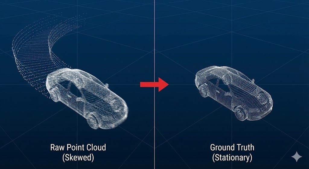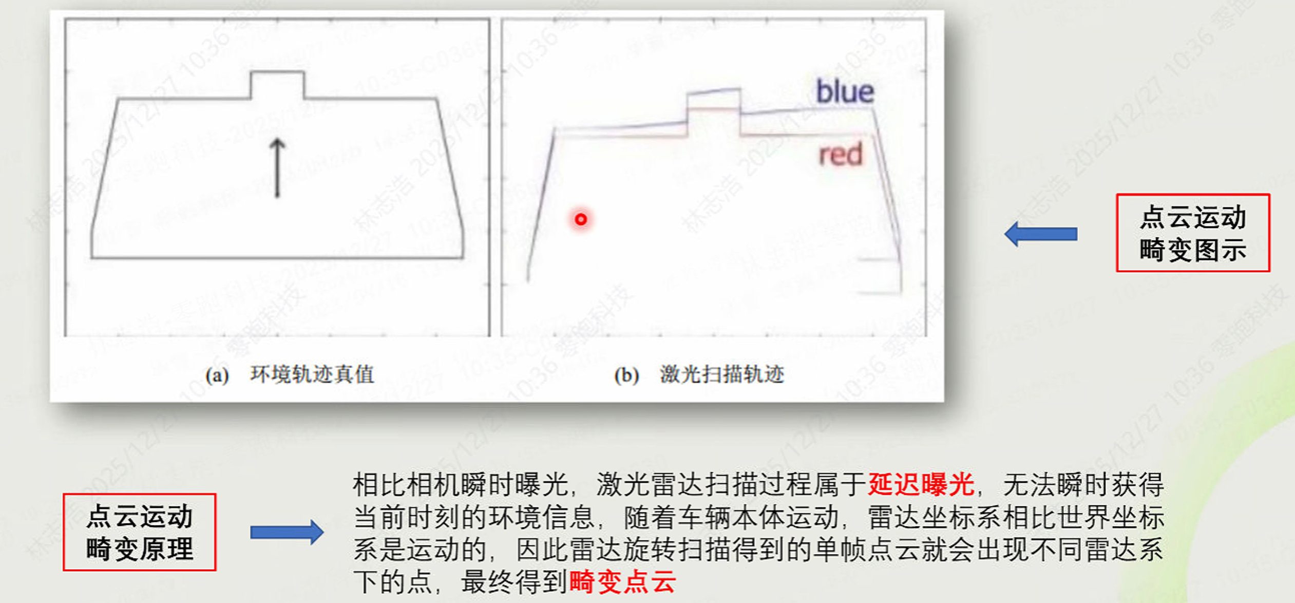 后果 :雷达刚开始扫到的"车头"和最后扫到的"车尾",实际上是在两个不同位置采集的。把它们拼在同一帧里,世界就扭曲了。