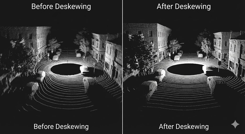 最后的这张图通过一个真实的街道场景,直观地对比了去畸变前后的效果。左侧的点云模糊、扭曲,物体边缘呈波浪状;而右侧经过处理的点云则锐利、清晰,准确还原了建筑物、树木和车辆的几何形态。这有力地证明了代码的实际价值。