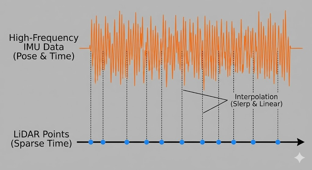 这张图解释了代码中关键的插值步骤。上方的橙色波形代表高频的 IMU 数据,下方的蓝色点代表低频的激光雷达点。垂直虚线展示了如何利用每个激光点的时间戳,在 IMU 数据曲线上"穿针引线",插值出该时刻精确的位姿(旋转和平移),这对应了代码中的 Slerp 和线性插值。