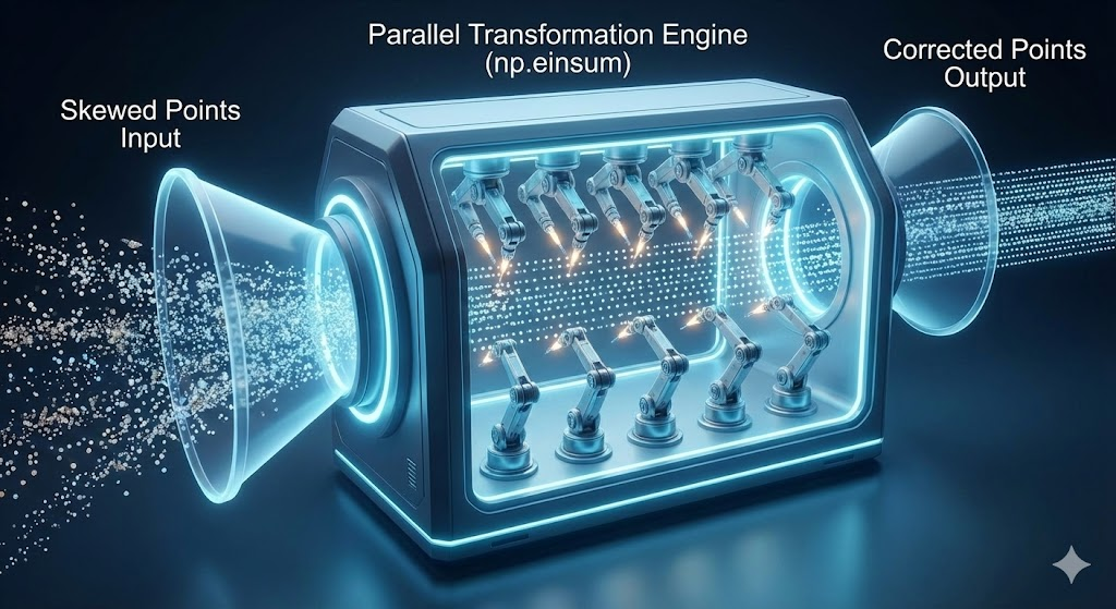 为了形象地解释代码中高效的 np.einsum 操作,这张图使用了一个"并行变换引擎"的隐喻。杂乱的原始点云进入引擎,内部无数的机械臂(代表插值得到的旋转矩阵)同时工作,瞬间将所有点修正到统一的坐标系下,并输出整齐的矫正点云。这生动地展现了向量化计算的威力。