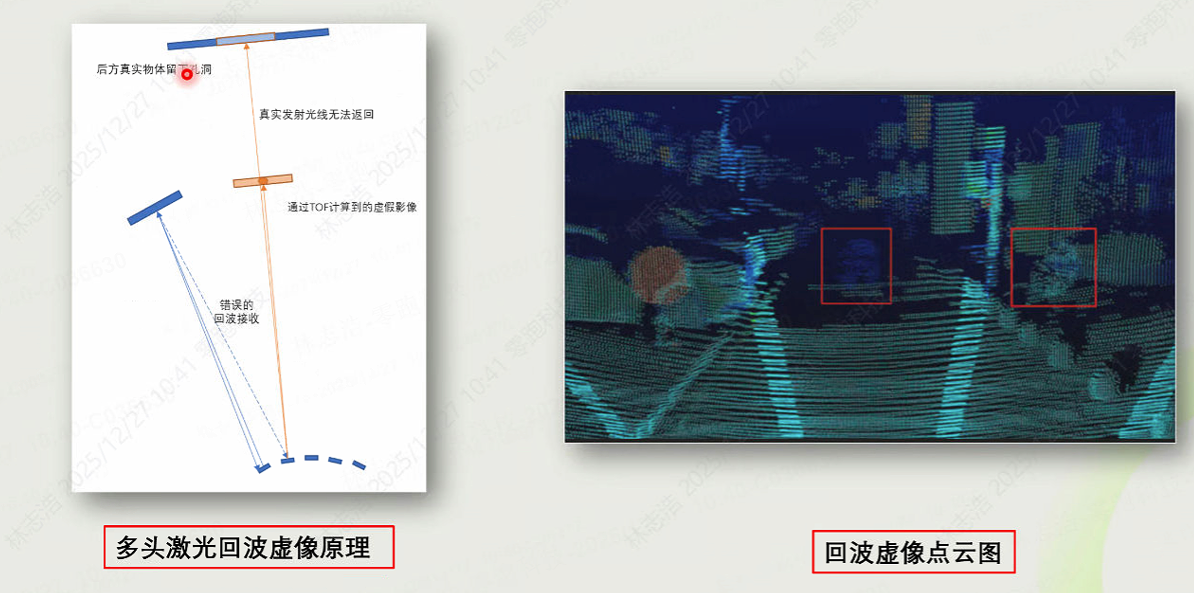 雷达不知道光跑了弯路,它只根据飞行时间(ToF)计算距离。结果就是:玻璃墙后面(或地下)出现了一簇虚假的障碍物点云。如果感知算法把这个"鬼影"当成真车,AEB(自动紧急制动)就会误触发。