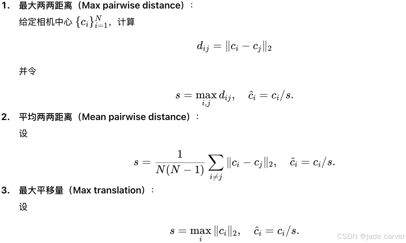 我们训练所使用的数据集中的真实相机位姿均通过 SfM 方法(Schonberger & Frahm, 2016)获得,而 SfM 的结果只在尺度上是确定的。为了避免尺度歧义对模型学习造成不利影响,有必要在训练过程中对场景进行归一化。