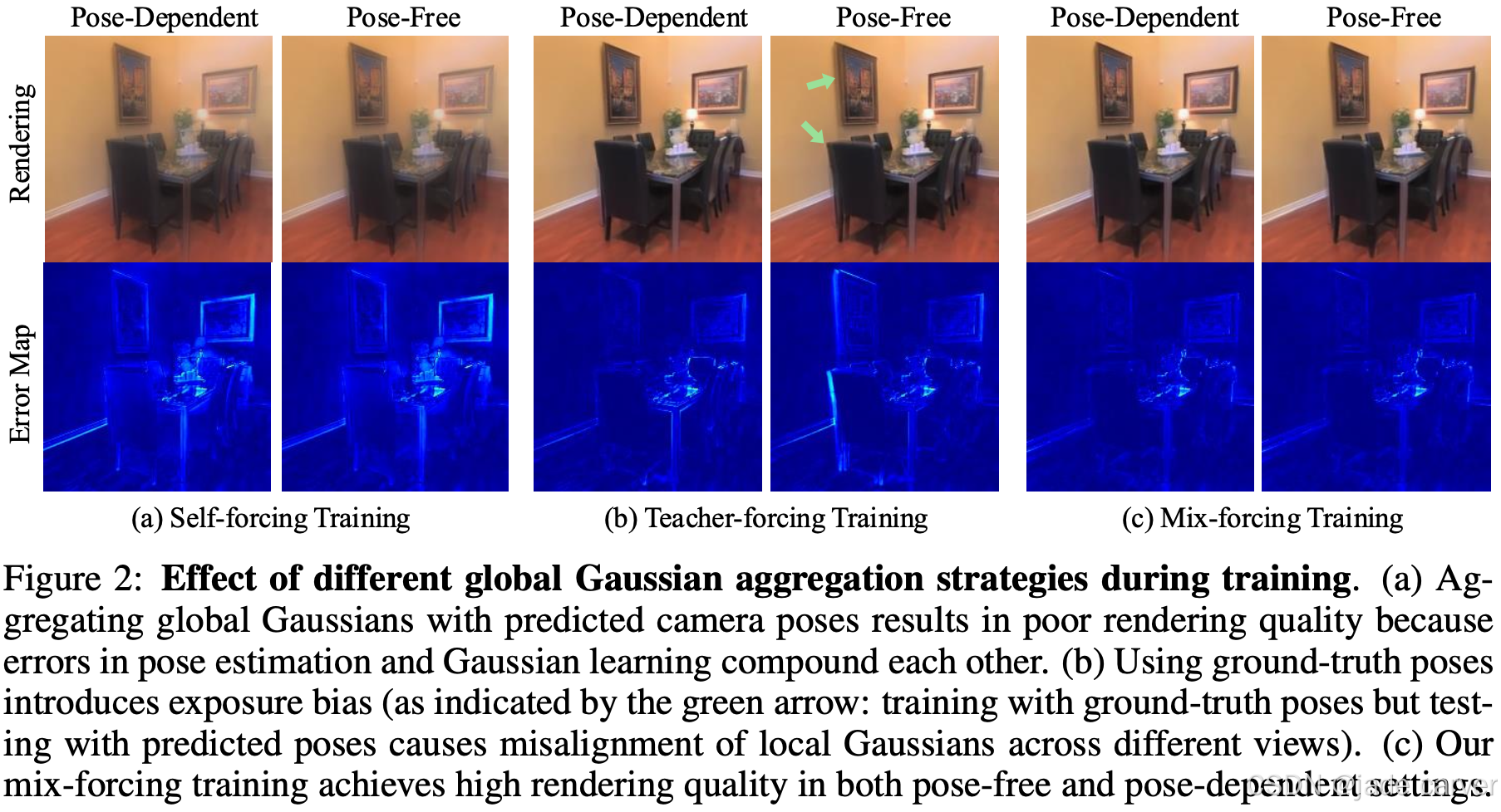 联合预测 3D 高斯和相机参数是一项具有挑战性的任务,因为其中一方的误差会直接干扰另一方。若仅使用预测的位姿进行聚合(即 self-forcing,Huang et al., 2025),会使两项任务高度耦合,从而导致训练不稳定并降低性能(见图 2、表 5)。而如果仅使用真实位姿(即 teacher-forcing,Williams & Zipser, 1989),虽然可以提供稳定的训练信号,但会引入暴露偏差(exposure bias)(Ranzato et al., 2015),因为模型在训练过程中从未接触自身的不完美预测。