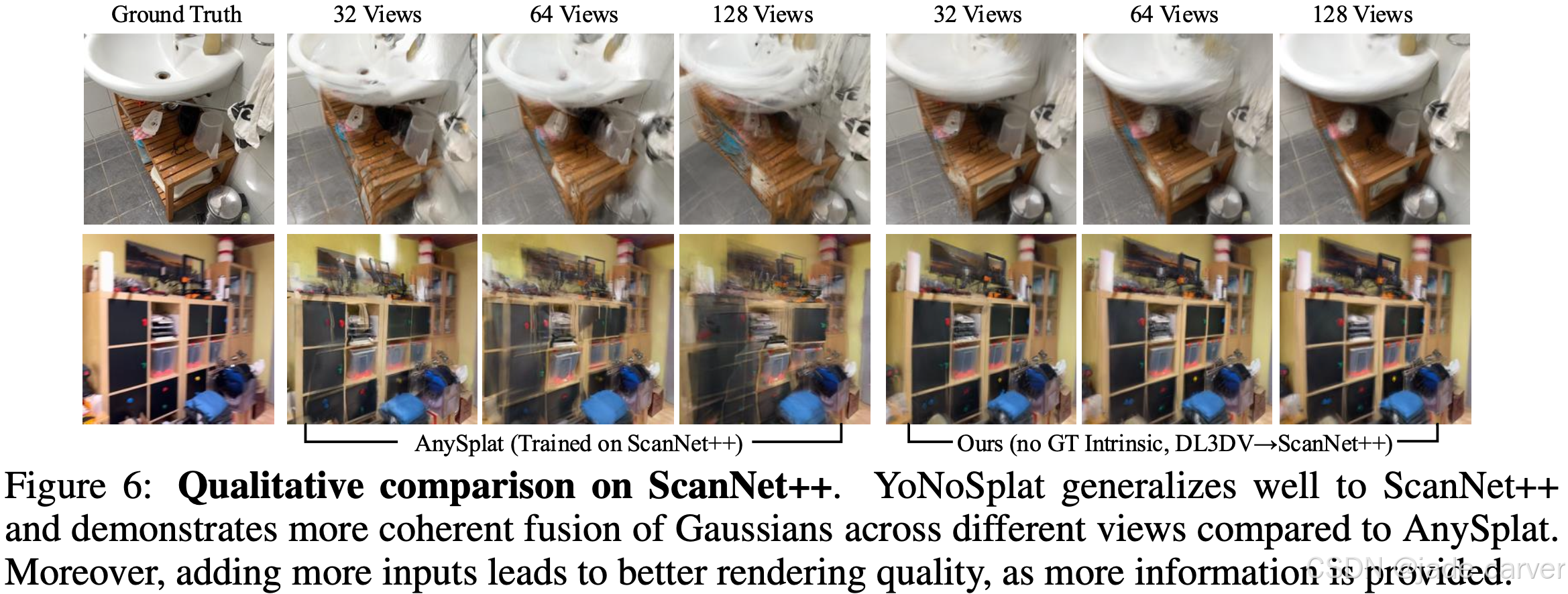 | Cross-Dataset Generalization | 模型训练: DL3DV → 测试: ScanNet++ | AnySplat (训练在 ScanNet++) | - YoNoSplat 显著优于 AnySplat,即使对方有训练域优势- 输入视角增加时性能持续提升- 定性效果更清晰、更连贯,信息融合更好- AnySplat 渲染较模糊且伪影明显 |