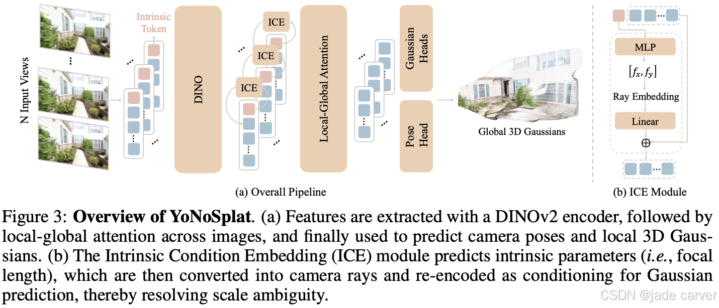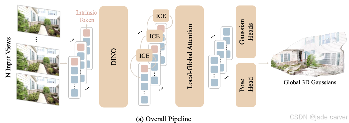 相比之下,依赖位姿的方法 ,如 pixelSplat(Charatan et al., 2024)和 MVSplat(Chen et al., 2024),是在每个视角的局部空间中预测高斯,并依赖真实的相机位姿将其转换到全局世界坐标系中。