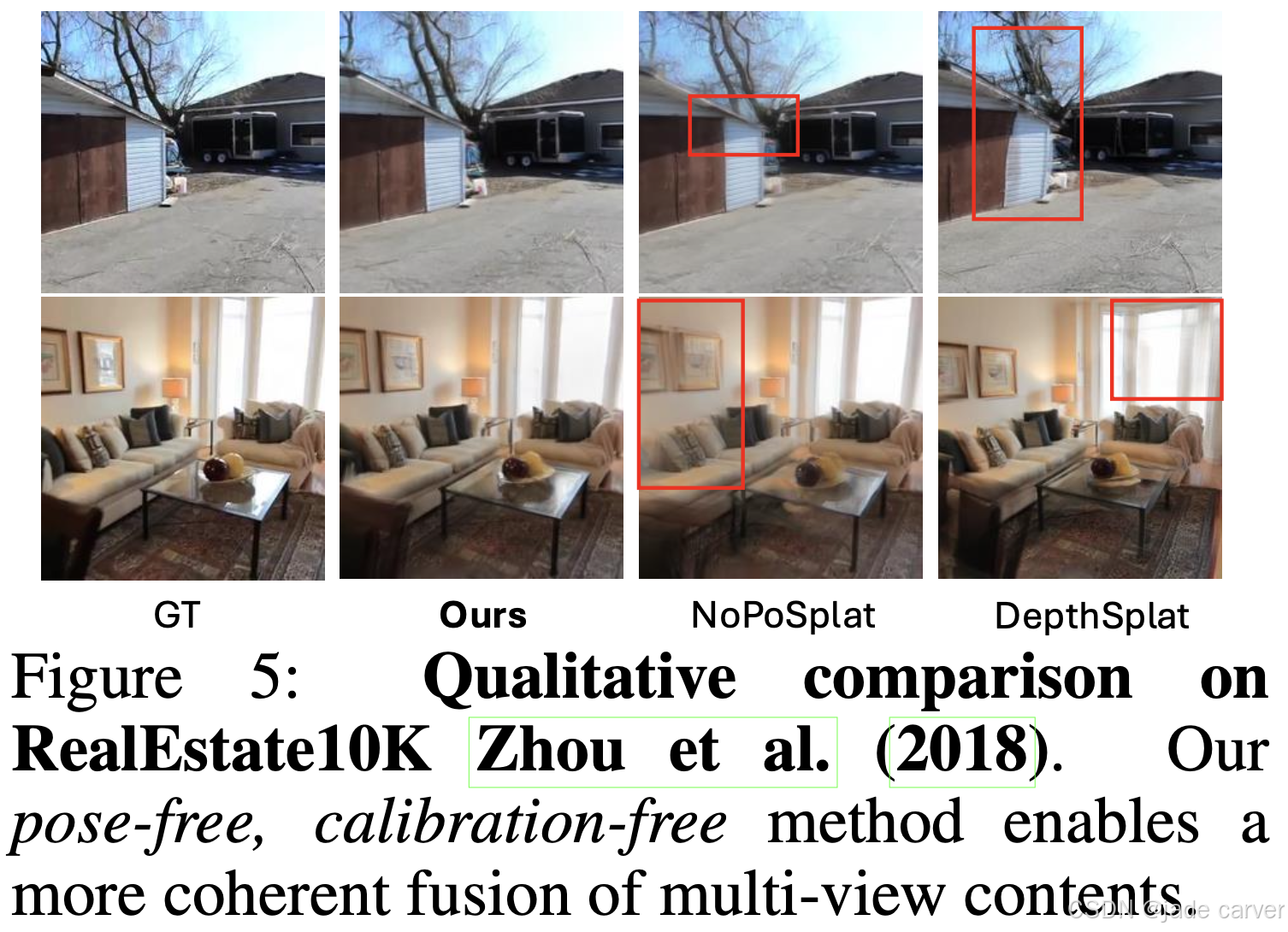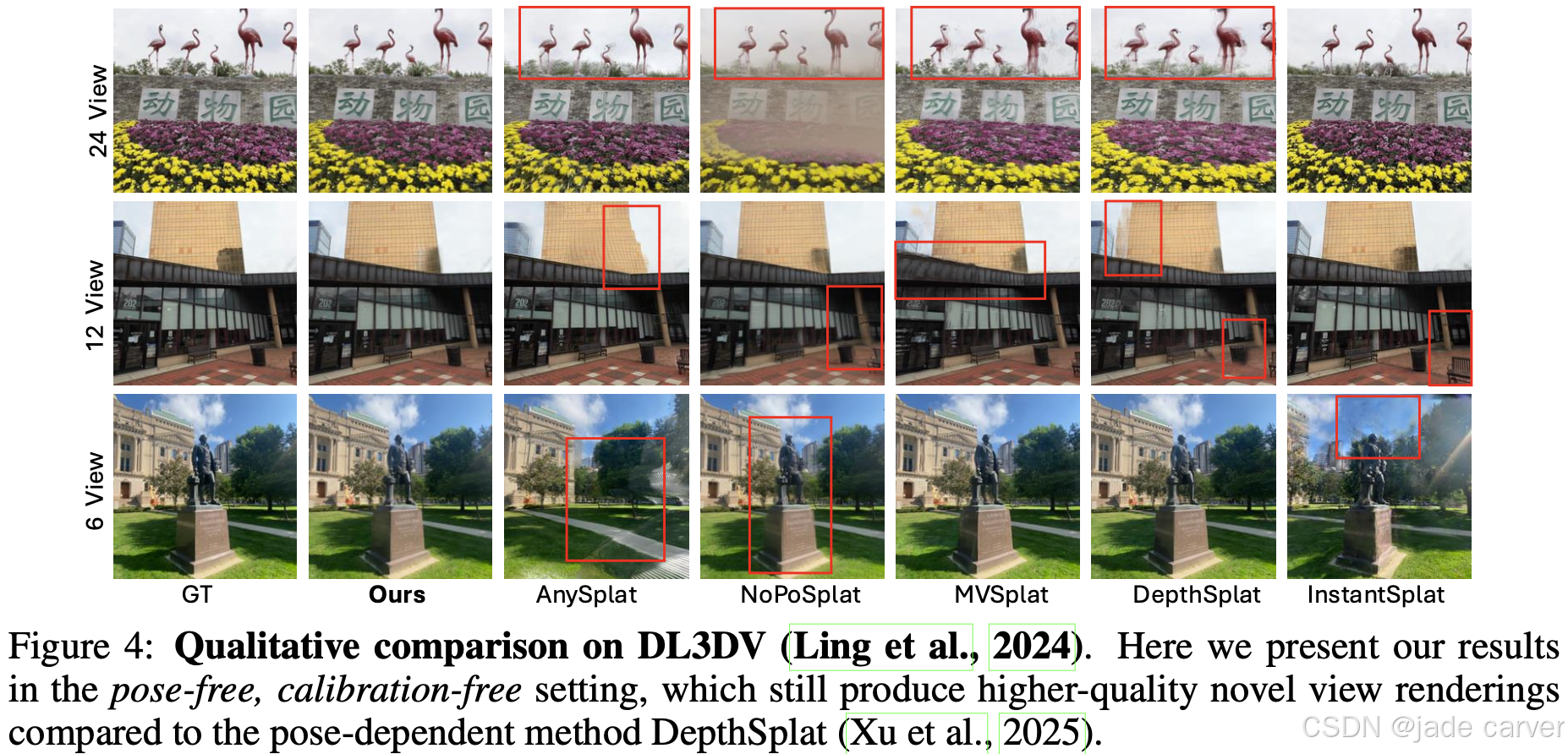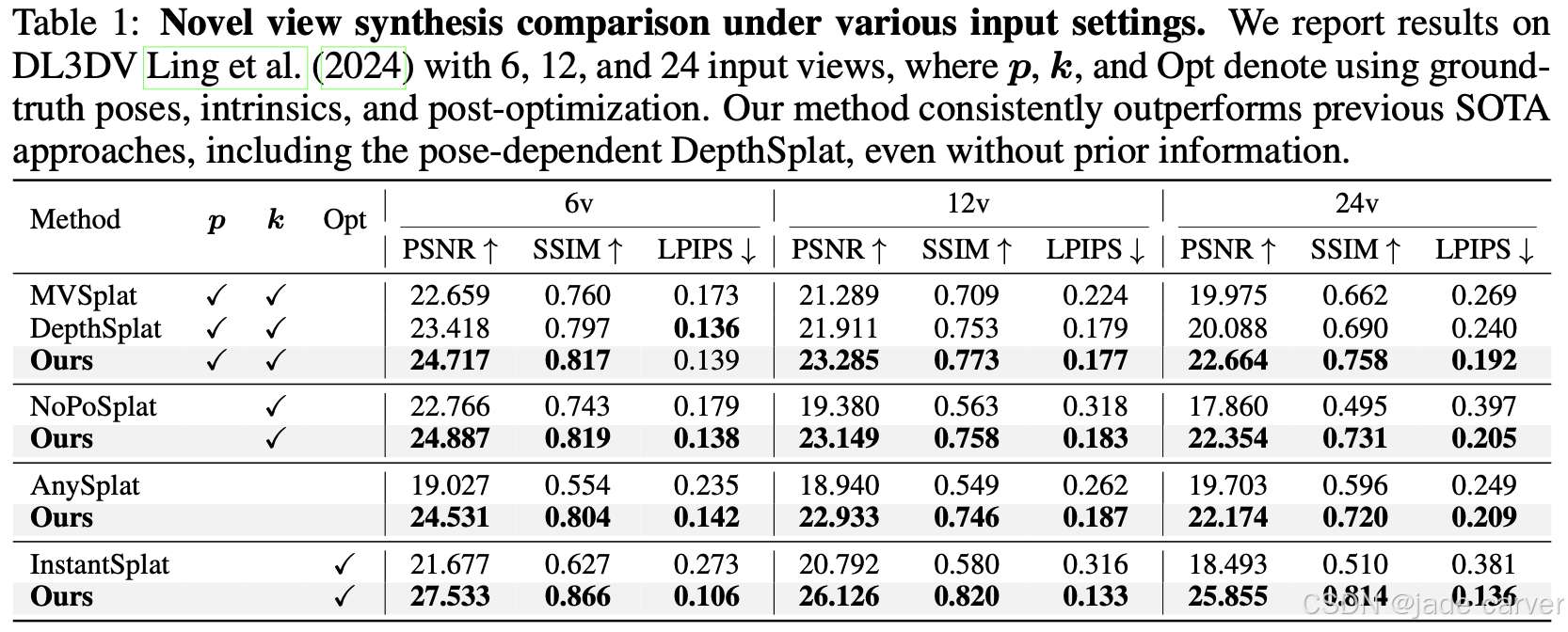 | 对比方法 | Optimization-based : InstantSplat Pose-dependent : MVSplat, DepthSplat Pose-free : NoPoSplat, AnySplat Relative pose estimation: MASt3R, VGGT, π³ |