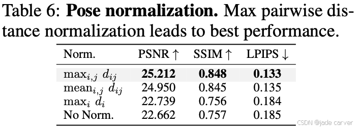 如表 6 所示,最大两两距离归一化 的效果最好,并且对模型的成功至关重要。由于我们采用的是相对相机位姿,使用最大两两距离进行归一化可以在训练过程中为相机平移提供一致的尺度。