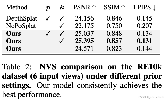 | 训练数据集 | RE10K : 67,477 train / 7,289 test, 室内视频 DL3DV: 10,000室外视频, 140 test |