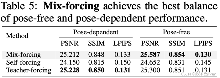 为了解决这一矛盾,我们提出了一种新的 mix-forcing 训练策略 ,结合了上述两种方法的优势。训练初期,模型仅使用真实位姿(teacher-forcing),以学习稳定的几何结构基础 ;在达到预设的训练步数