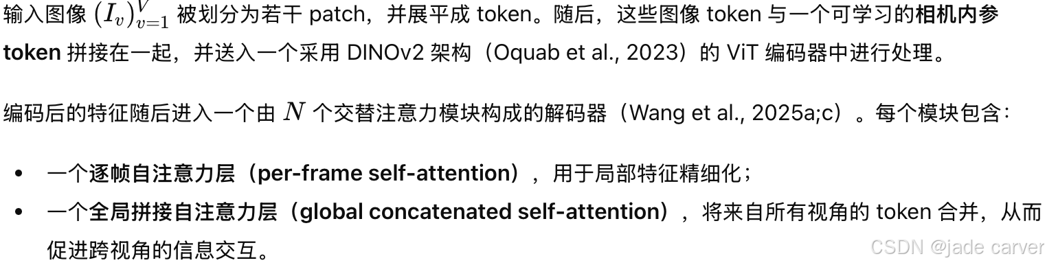 我们基于 Vision Transformer(ViT)(Dosovitskiy et al., 2021)作为主干网络,并采用与 VGGT(Wang et al., 2025a)相同的局部--全局注意力机制进行多视角特征融合。相比以往工作中使用的跨视角注意力机制(Ye et al., 2025),该设计在面对大量输入帧时具有更好的扩展性。