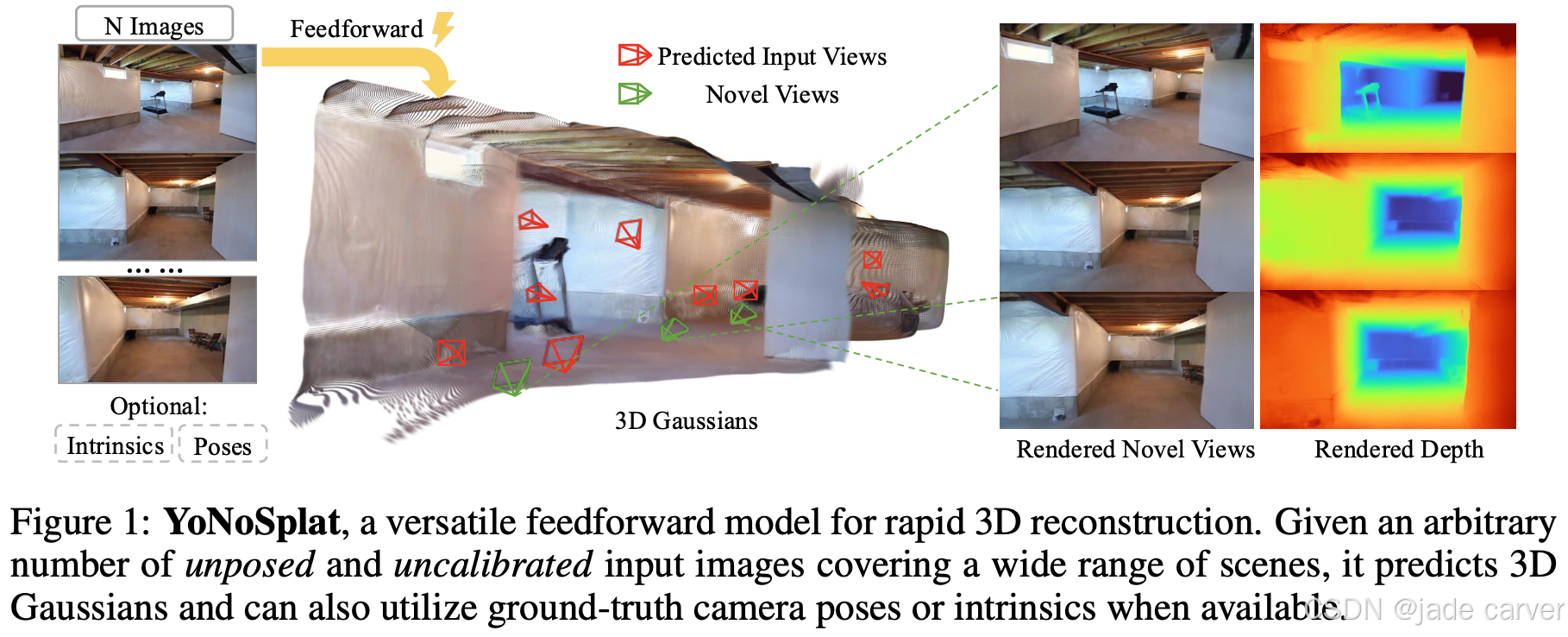 前馈式高斯泼溅(Charatan 等人,2024;Zhang 等人,2025a)已成为加速三维场景重建的一个前景广阔的方向,它能够直接从输入图像预测三维高斯参数。这种方法绕过了如神经辐射场(NeRF)(Mildenhall 等人,2020)和原始三维高斯泼溅(3DGS)(Kerbl 等人,2023)等方法所需的对每个场景进行耗时的优化过程。然而,现有前馈模型的实际应用往往受到诸多限制性假设的制约,例如需要精确的相机位姿(Charatan 等人,2024;Xu 等人, 2025)、标定的相机内参(Ye 等人,2025;Zhang 等人, 2025b),或固定且有限的输入视角数量(Ye 等人,2025;Chen 等人,2024)。在实践中,场景重建需要在灵活且无约束的条件下进行:相机位姿可能无法获取或存在噪声,相机内参未知,且图像数量可能差异巨大。设计一个能在这些多样化的设置下------视角数量可变、有无位姿信息、有无标定信息------均能泛化的单一模型,仍是一个开放的挑战。