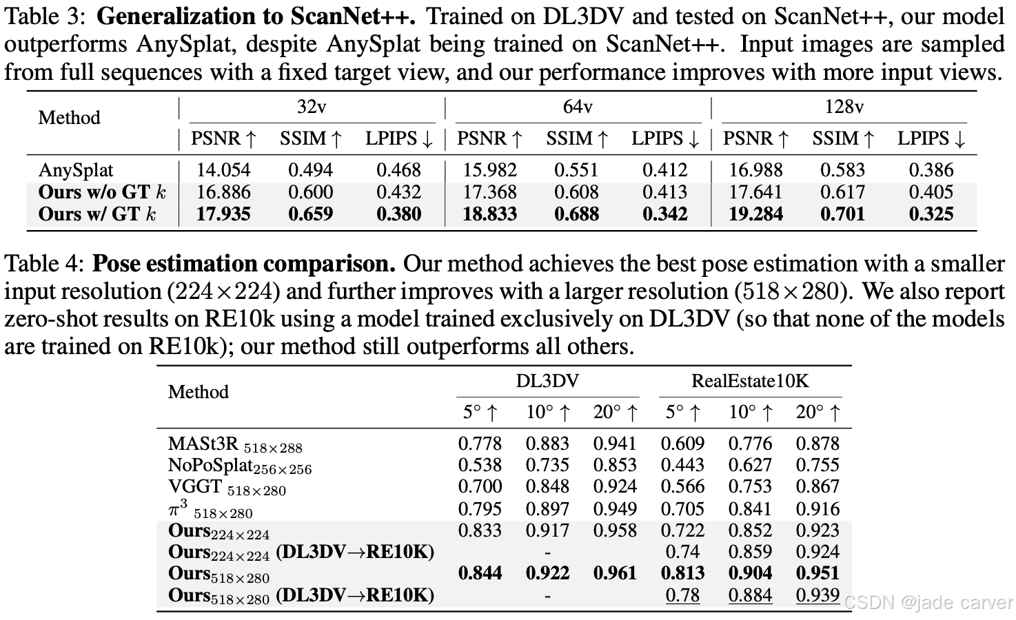 | Camera Pose Estimation | DL3DV,小分辨率 224×224 / 大分辨率 518×280 | MASt3R, VGGT, π³ 等 SOTA 方法 | - 小分辨率下已优于 SOTA- 大分辨率下进一步提升性能- DL3DV → RE10K 测试也优于所有基线,说明模型泛化能力强- 渲染损失训练也能提升位姿估计精度 |