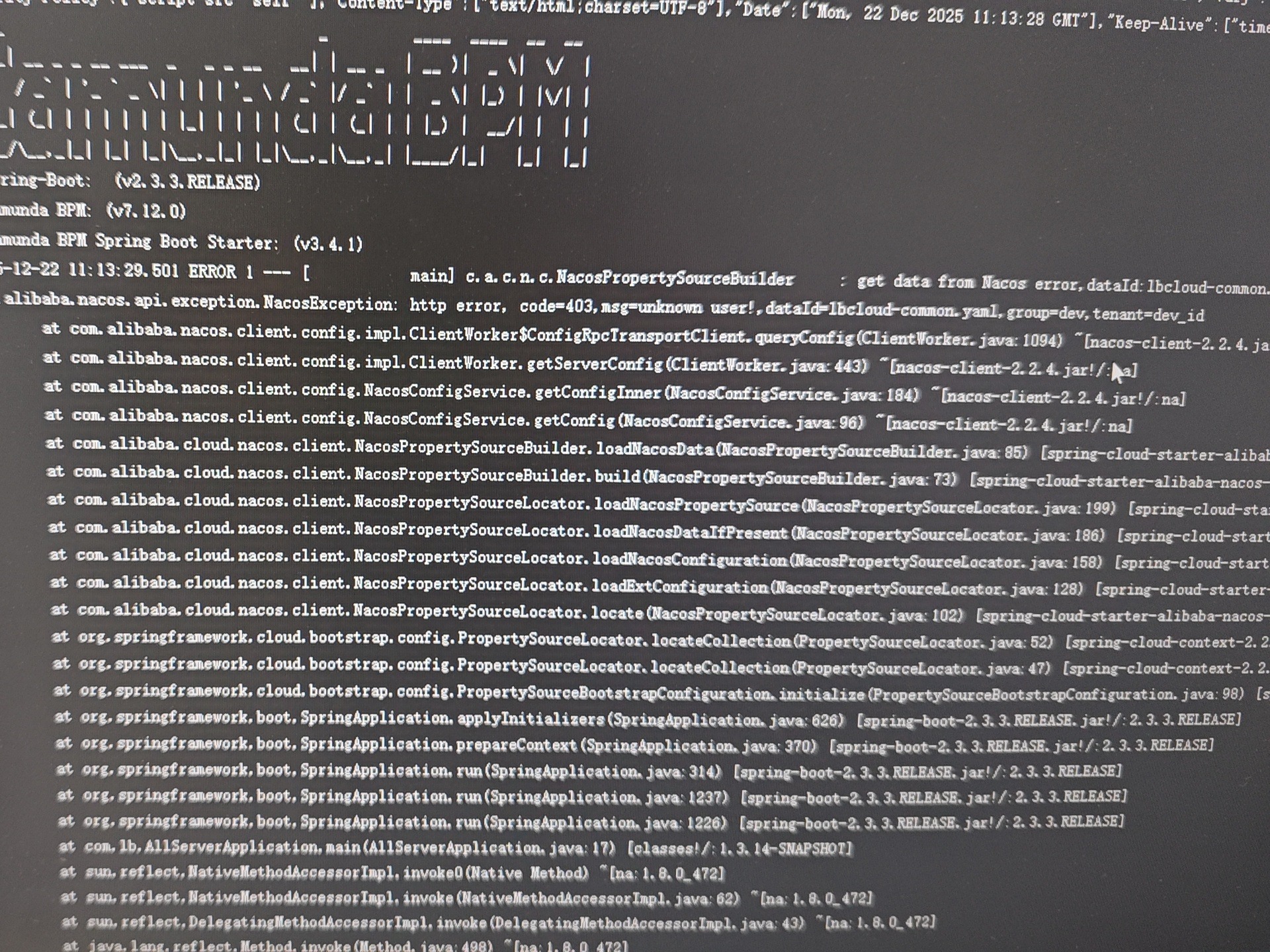 第二组是认证相关的错误 :Nacos 403 Forbidden (unknown user),伴随"Can not register service to Nacos"的提示,说明服务注册环节也因认证问题被Nacos服务端拒绝。