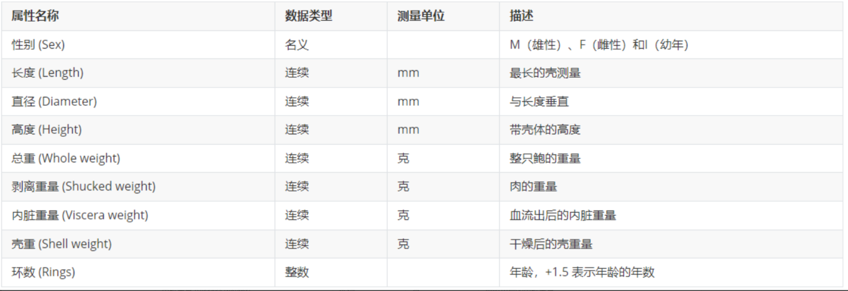 本例使用了一个Abalone(https://archive.ics.uci.edu/dataset/1/abalone)数据集(已经下载好的数据集->📎abalone.zip),其中abalone.data是数据,abalone.names是本案例数据的英文解释。以下是数据集的中文解释: