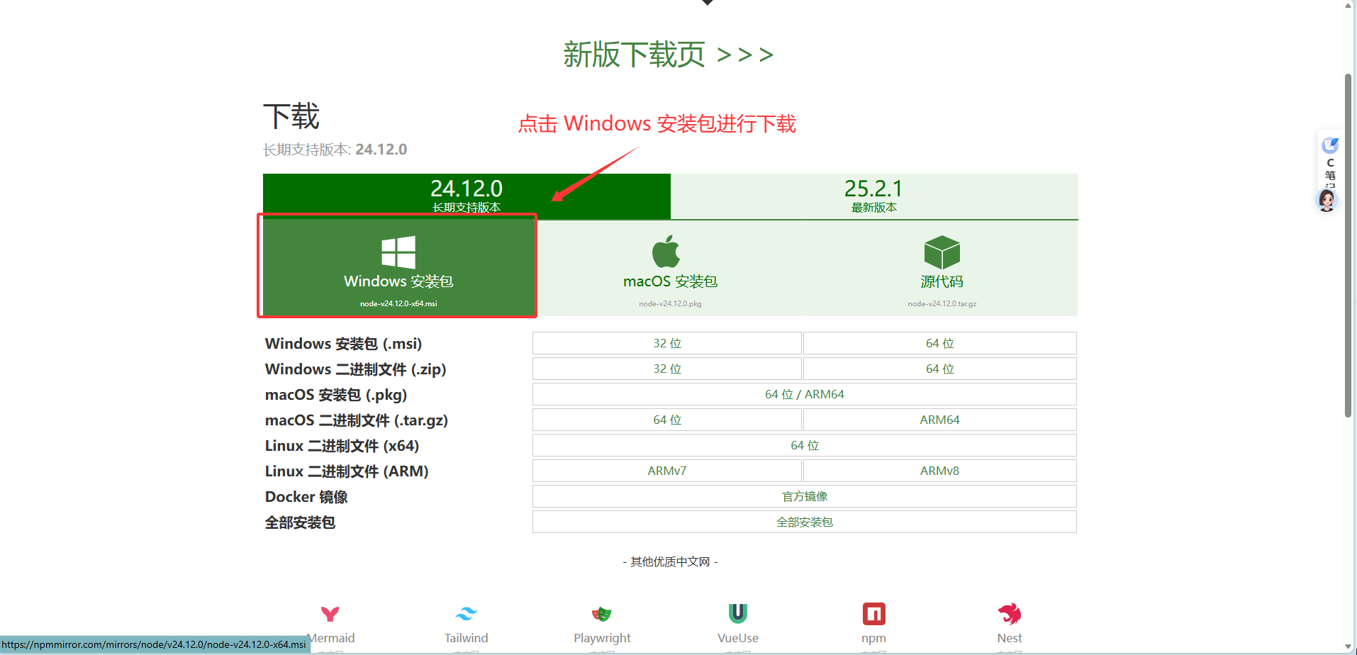 跳转到 Node.js 下载页,点击 Windows 安装包,会根据使用的电脑,自动匹配适用操作系统版本的安装包,进行安装包下载。