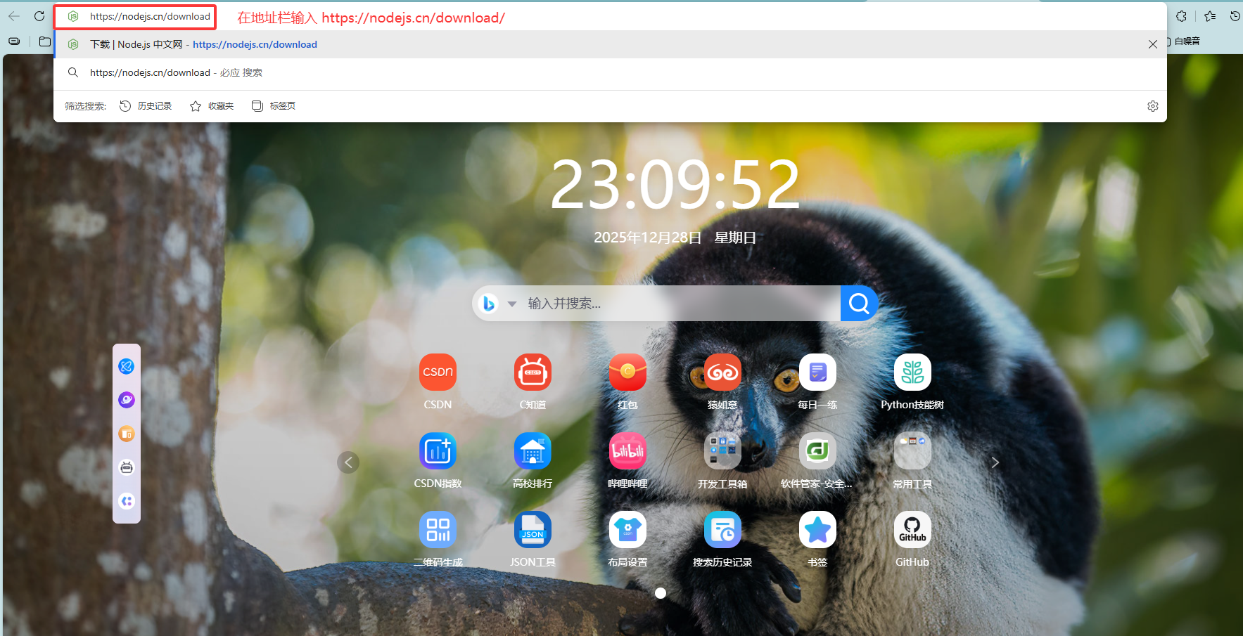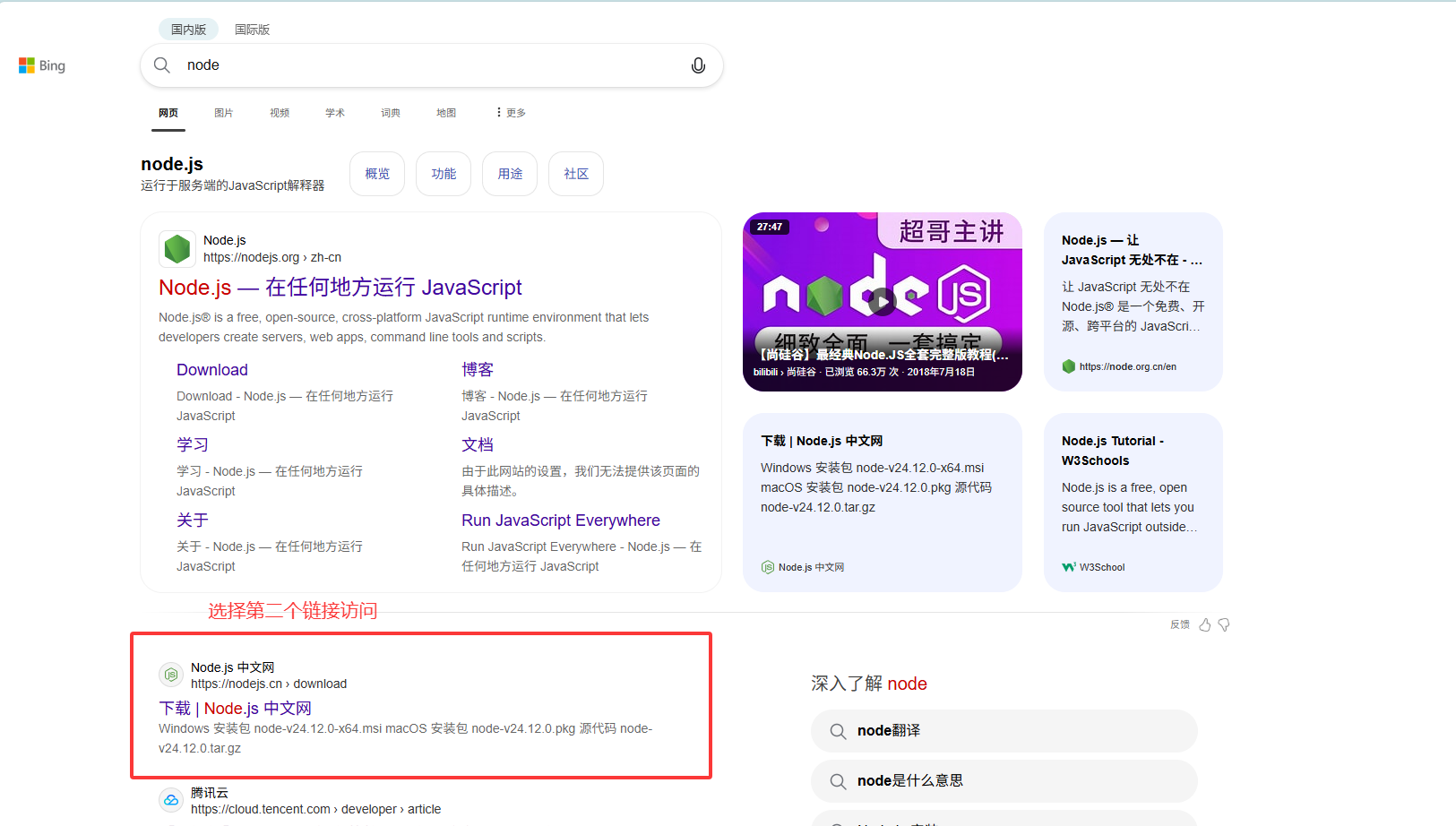 或在地址栏中输入 node 回车搜索,然后点击第 2 个链接访问(因为每个人使用电脑习惯的不同,浏览器搜索历史等原因,下载 | Node.js 中文网的链接位置不一是在第 2 个,请根据自己搜索情况确认正确的链接后访问),如图所示,这里搜索后链接位置是在第 2 个,所以直接点击第 2 个链接访问即可。