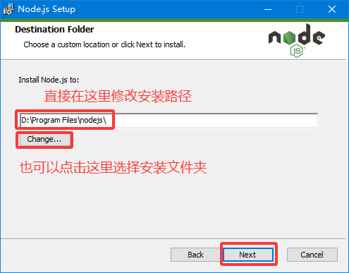 在这里可以修改安装位置,也可以选择默认安装位置,建议安装在 D 盘,点击 Change 修改安装位置,也可以在默认安装路径直接修改,把 C 修改成 D ,修改安装路径,根据个人使用习惯选择安装文件夹。