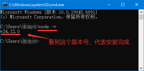 在命令提示窗口,输入 node -v,点击回车查看是否显示,Node.js 版本号,看到如图所示,显示 node 版本号 v24.12.0,就代表安装完成,如果不显示则代表需要手动配置 Node.js 环境变量,如何配置环境变量,请查看参考如何配置环境变量教程。