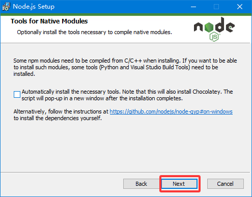 在选择安装原生模块所需的工具时,默认不勾选,点击 Next 继续安装即可,后需如有需求可以再次运行安装包执行安装。