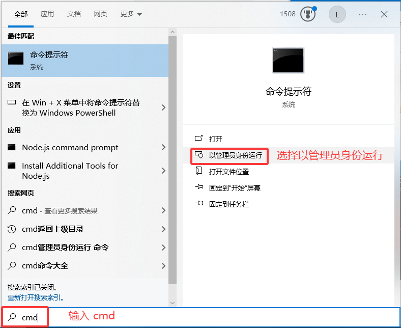 也可以在搜索框搜索 cmd,找到命令提示符然后选择以管理员身份运行。