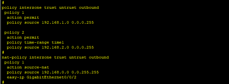 配置安全策略,配置出接口方式的源NAT策略,使得私网用户借用防火墙的公网接口IP地址来访问公网