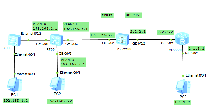 某企业采用防火墙作为出口安全网关,企业内网有两个部门:市场部和研发部,PC1代表市场部的主机,PC2代表研发部的主机。市场部和研发部不在同一栋大楼,而且交换机只有两台,一台是二层交换机3700,给市场部用,另一台是三层交换机5700,给研发部用,要求市场部全天可以上公网,研发部8:00到17:00不能上公网。所有上公网的数据流,在防火墙上配置NAT出接口方式转换。