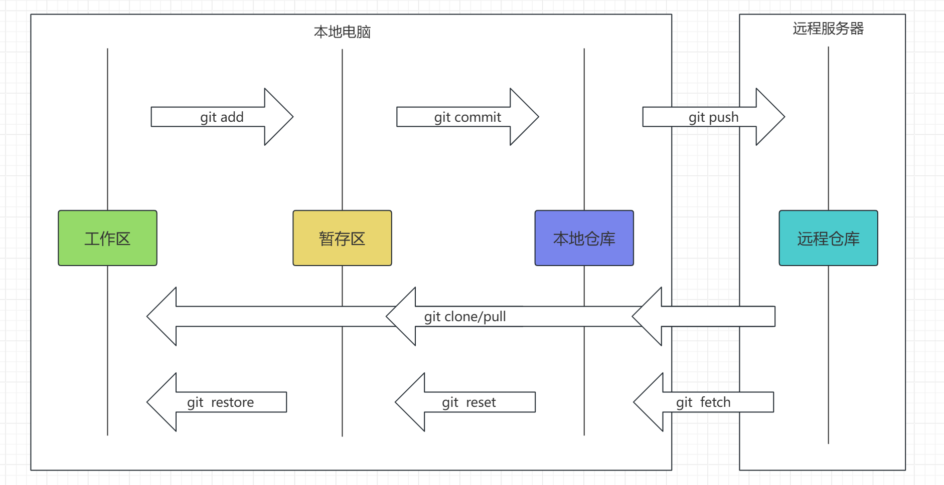 问题的本质在于对Git对象模型 与引用系统的理解深度。遇到git问题的时候,不要慌张,什么问题都是可以解决的,只是还没用习惯,然后下面是git的几个区域以及代码在之间的流动过程示意图。