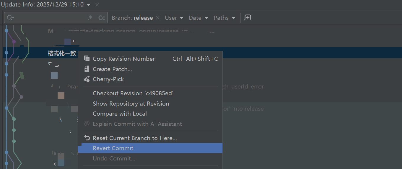 描述:比如要发版合代码了,本来是要A分支合到release分支上了,结果把B分支合上面了,而且已经推送到远程仓库上去了
