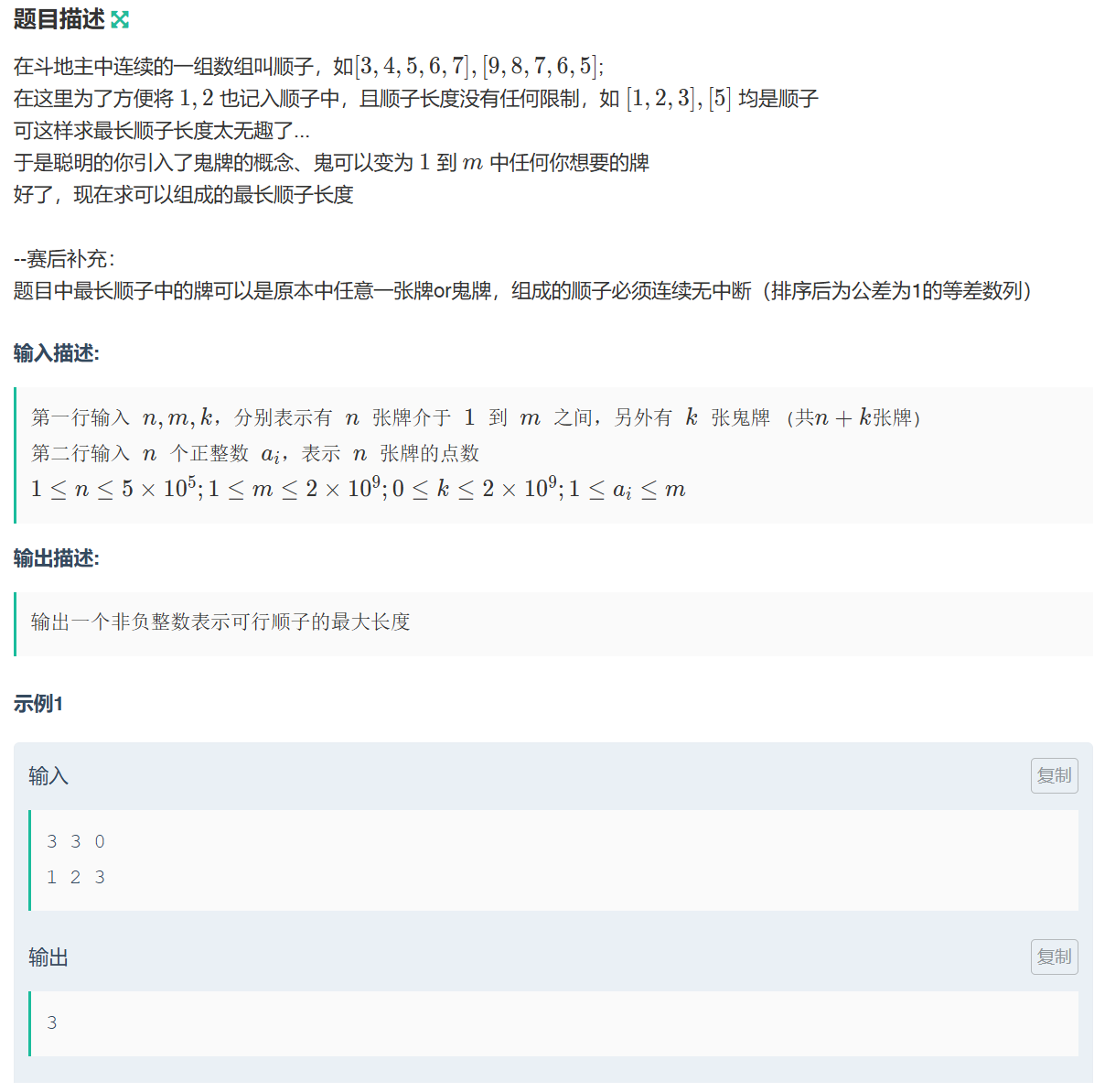 - 数据规模:m的范围到2×10^9,我原本想用前缀和统计1至m范围空缺的牌数,但这个规模数组是很难容纳的。