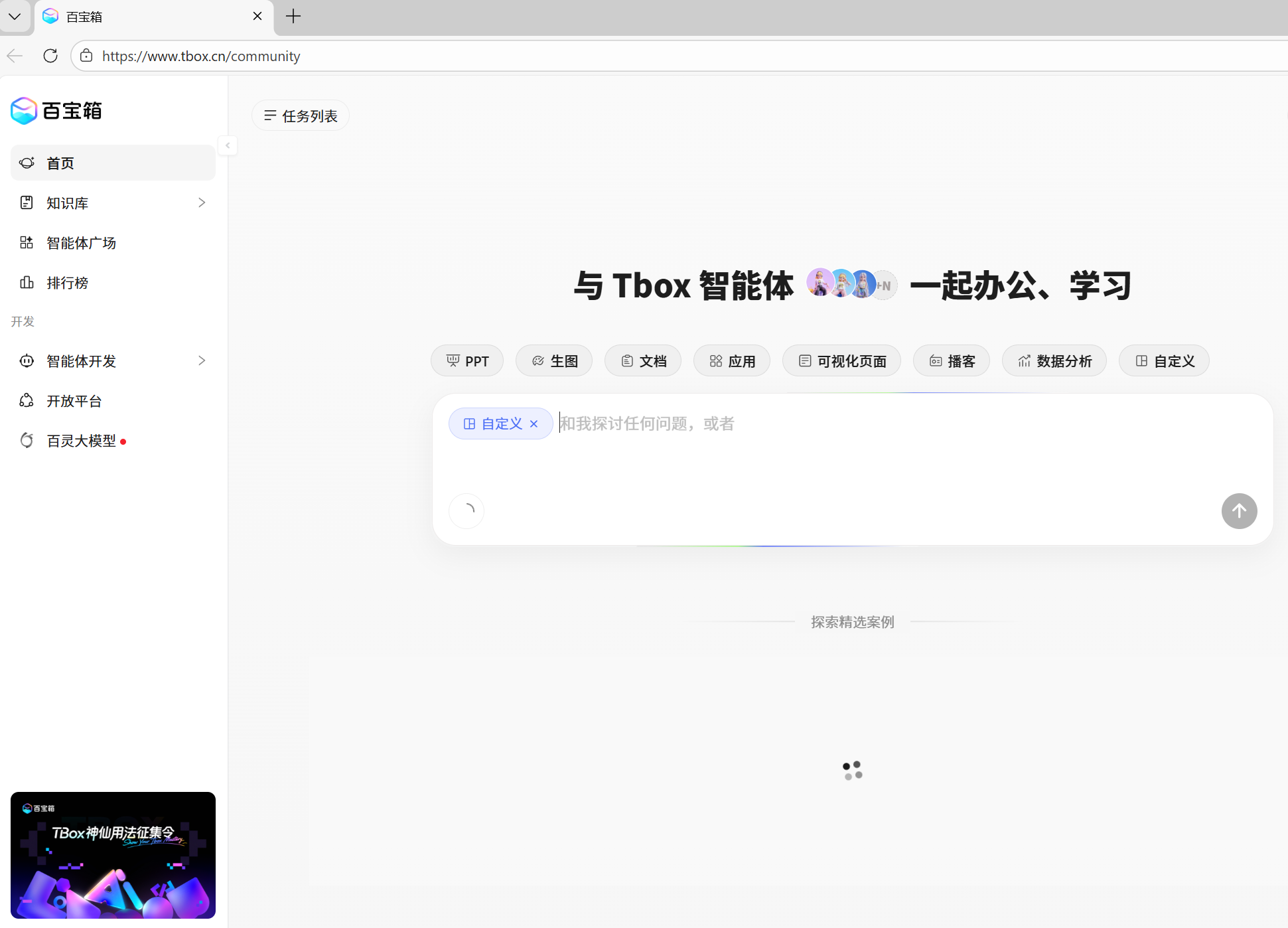 来到主界面,可以看到,Tbox多才多艺,可以生成PPT、图片、文档、页面和应用。