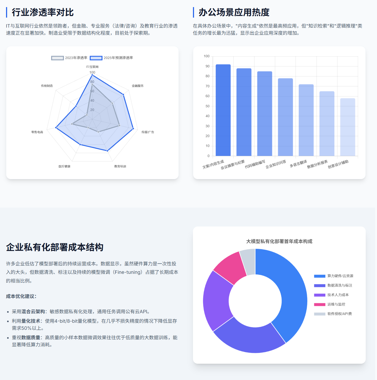 - 技术可行性:API调用、私有化部署、微调适配等路径