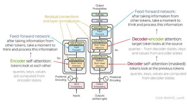 - 同样,在每个子层后面都有残差连接(图中的虚线)和层归一化(LayerNorm)操作,二者合起来称为Add&Norm操作。