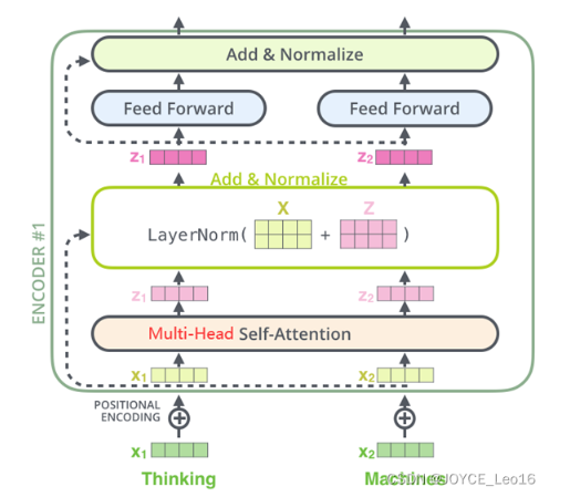 - 在每个子层后面都有残差连接(图中的虚线)和层归一化(LayerNorm)操作,二者合起来称为Add&Norm操作。