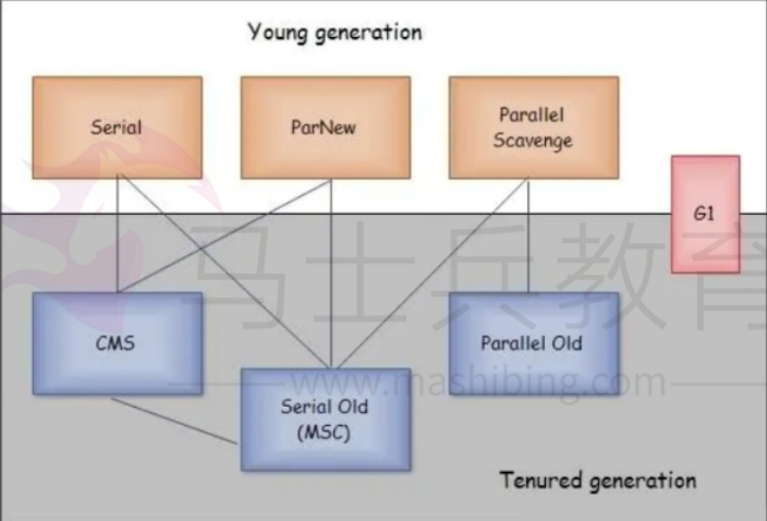 如果说垃圾收集算法 是内存回收的方法论,那么垃圾收集器 就是内存回收的具体 实现。下图展示了7种 作用于不同分代的收集器,其中用于回收新生代 的收集器 包括Serial 、PraNew 、Parallel Scavenge ,回 收老年代 的收集器包括Serial Old 、Parallel Old 、CMS ,还有用于回收整个Java堆 的G1收集器。不同收集器之间的连线表示它们可以搭配使用。