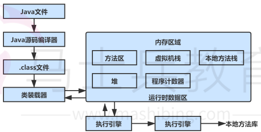 作用:首先通过编译器把 Java 代码转换成字节码,类加载器(ClassLoader) 再把字节码加载到内存 中,将其放在运行时数据区(Runtime data area)的方 法区内,而字节码文件只是 JVM 的一套指令集 规范,并不能直接交给底层操作 系统去执行,因此需要特定的命令解析器执行引擎(Execution Engine),将 字节码翻译成底层系统指令,再交由 CPU 去执行,而这个过程中需要调用其他 语言的本 地库接口(Native Interface)来实现整个程序的功能。