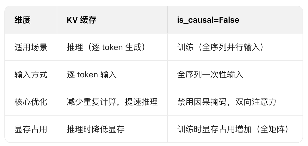 3. 场景层面:KV 缓存适配推理,is_causal=False 适配训练
