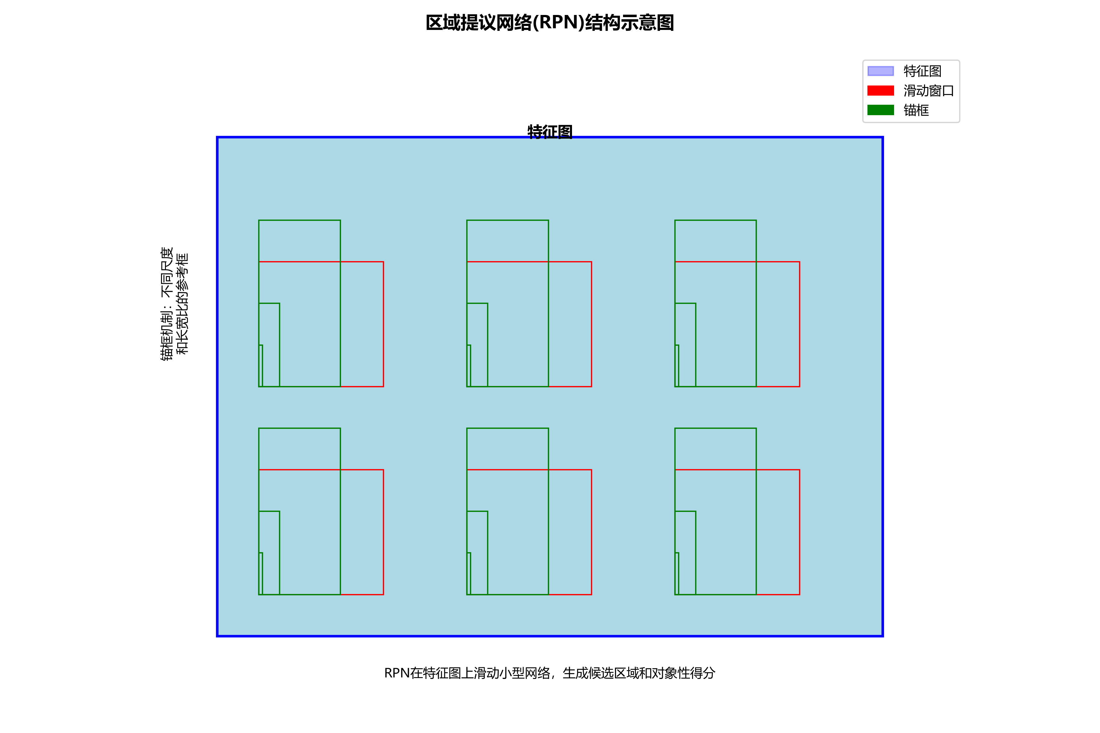 区域提议网络(RPN)是Faster R-CNN的核心创新点,它通过在特征图上滑动一个小型网络,同时生成候选区域和对象性得分。RPN使用锚框(Anchor)机制,在不同尺度和长宽比上预设一组参考框,然后对这些参考框进行评分和调整。