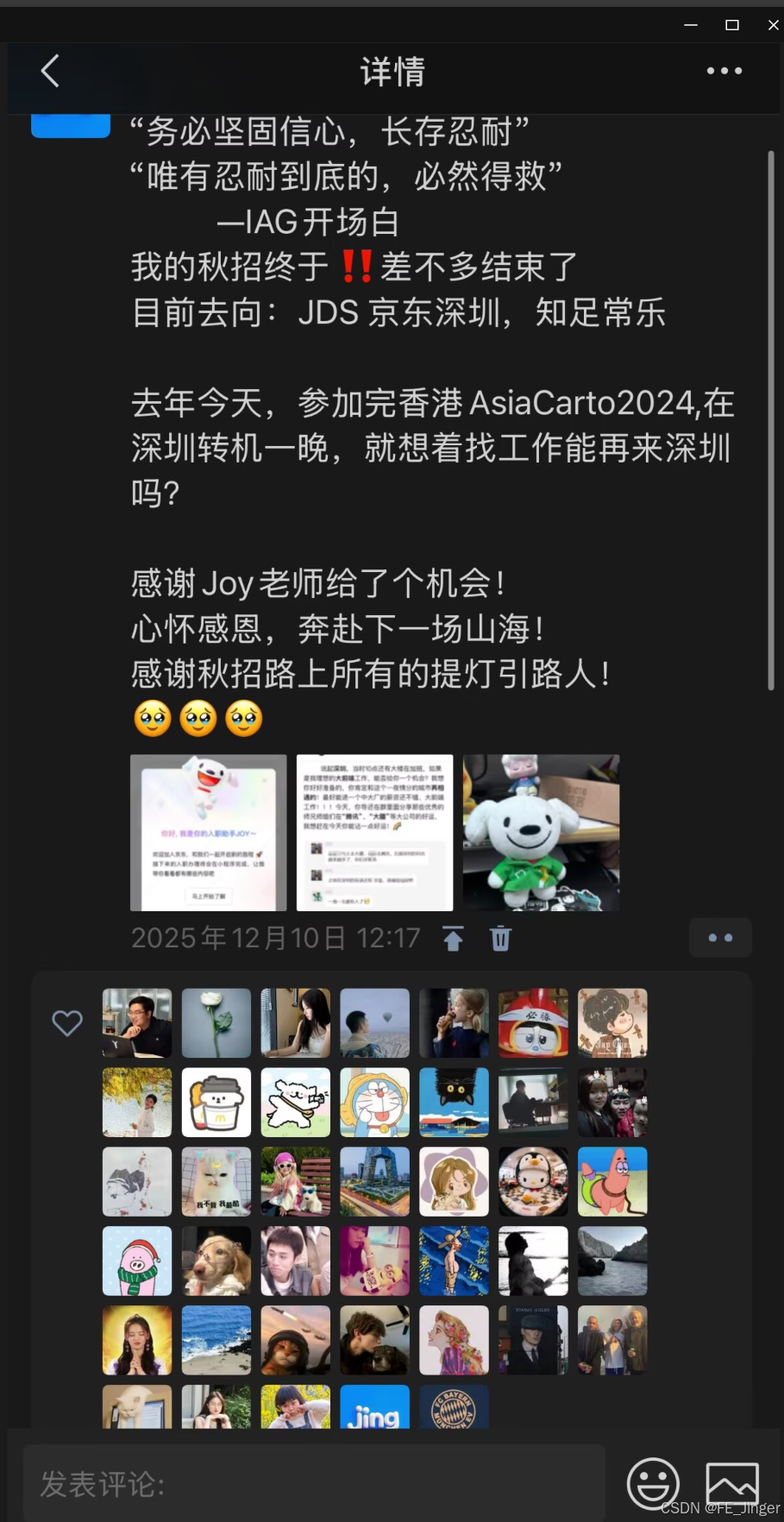 找工作"。我坚持选择了前端方向,最终收获了不错的结果------签约JDS京东深圳。这无疑是我这一年中最值得纪念、也是突破的一点。